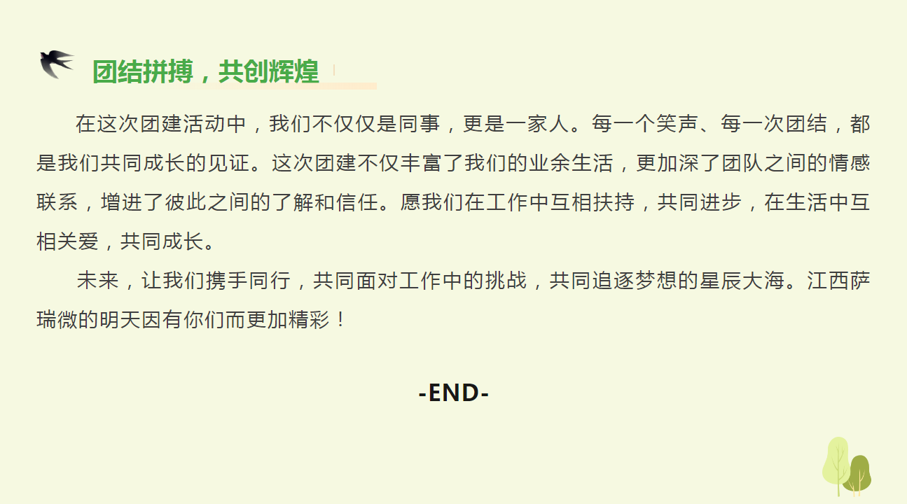 一个人的努力是加法,一个团队的努力是乘法,真正的团队是你中有我,我中有你的包容;我们一起感受团队合作、凝心聚力的快乐!